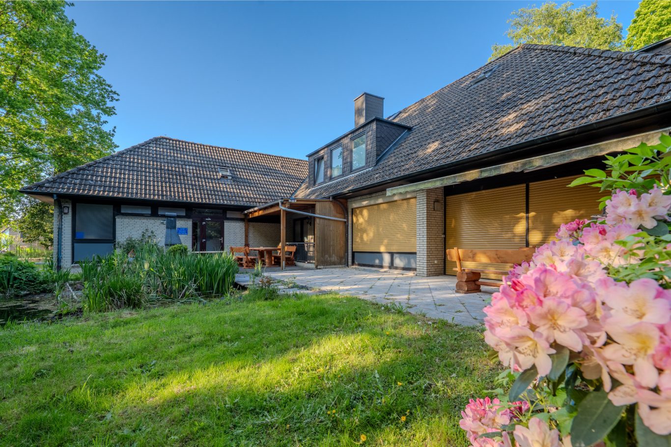Das weitläufige Grundstück mit gepflegten Grünflächen und einem idyllischen Teich lädt zu entspannten Stunden im Freien ein. Es bietet zudem Potenzial für weitere Gestaltung – ob Gartenanlage, Freizeitflächen oder Erweiterungen im Rahmen der baurechtlichen Möglichkeiten.